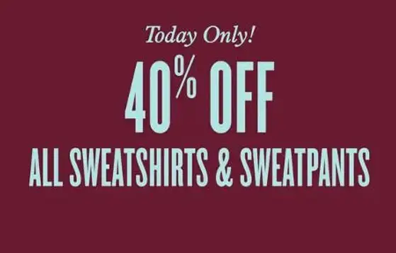 Today only! Shop in store and get 40% off all sweatshirts & sweatpants.