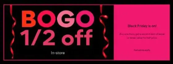 Shop in store and buy one item, get a second item of equal or lesser value for half price.