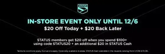 Score $20 off today with code STATUS20 when you spend $100+ in-store, plus earn $20 in STATUS Cash to use in January.