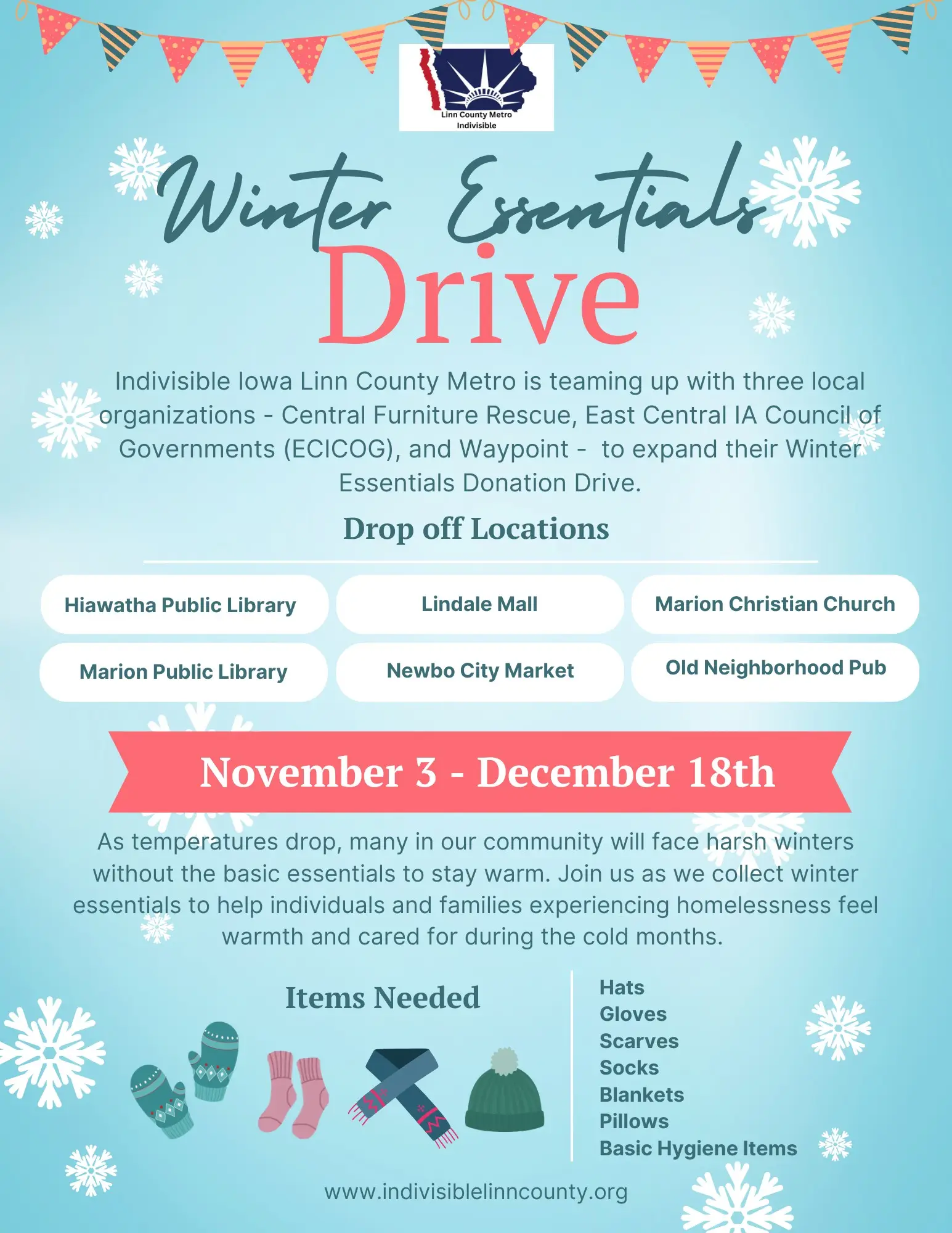 Indivisible Iowa Linn County Metro is partnering with Central Furniture Rescue, East Central Iowa Council of Governments (ECICOG), and Waypoint to expand their Winter Essentials Donation Drive!
